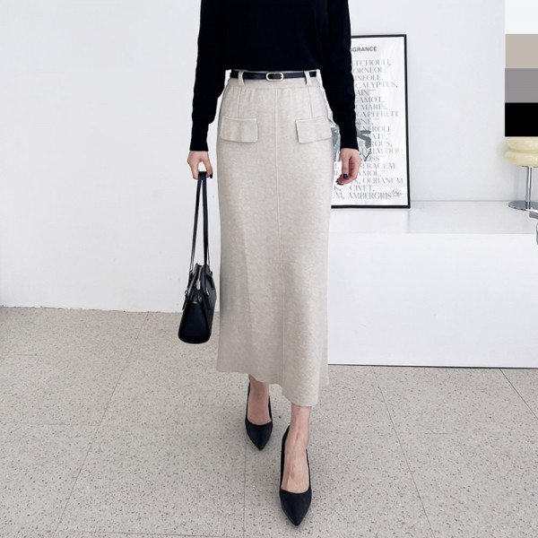 도톰 H라인 뒤트임 니트 롱 울스커트(벨트세트) > 롱스커트